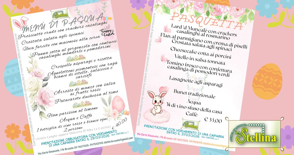 🐣🍝 Pasqua E Pasquetta? All’Antica Trattoria La Stellina festeggi DUE volte con DUE menu diversi! 🐰✨ Domenica: agnolottoni piemontesi, arrosto di manzo e vini DOC a 40€ 🍷 Lunedì: vitello tonnato, lasagnette agli asparagi e bunet tradizionale a 33€ 🥧 Porta tutta la famiglia in Valle di Susa e vivi la Pasqua come una volta! 👨👩👧👦💛 Prenota ora con caparra 📞 011 9637205 – 347 5921415 🏔️🌷